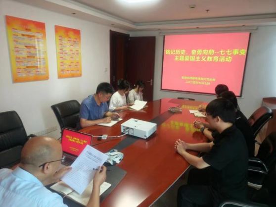 殷忧启圣,多难兴邦。斯人已逝,忠魂犹存。党支部书记首先带领大家回顾了七七事变的过程:1937年7月7日夜10时,驻丰台日军河边旅团第一联队第三大队第八中队,由中队长清水节郎率领,在卢沟桥以北地区举行以攻取卢沟桥为假想目标的军事演习,11时许,日军诡称演习时一士兵离队失踪,要求进城搜查。在遭到中国驻军第二十九军第三十七师二一九团团长吉星文的严词拒绝后,日军迅即包围宛平县城。翌晨2时,第二十九军副军长兼北平市长秦德纯为防止事态扩大,经与日方商定,双方派员前往调查。但日军趁交涉之际,于8日晨4时50分,向宛平县城猛烈攻击。并强占宛平东北沙岗,打响了攻城第一枪,中国守军忍无可忍,奋起还击,日军在同一天内,连续进攻宛平城三次,均遭中国守军的英勇抵抗。“卢沟桥事变”揭开了全国抗日战争的序幕......