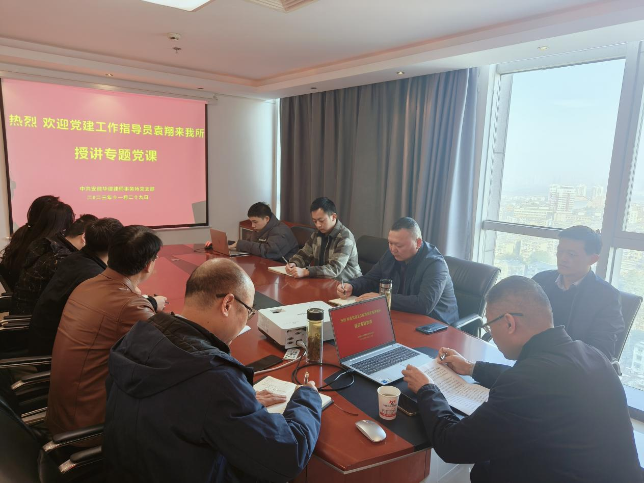 根据中央、省市有关文件精神,华律所党支部为推进本所开展主题教育活动,推动本所全体律师更加深刻领悟“两个确立”的决定性意义,更加自觉增强“四个意识”、坚定“四个自信”、做到“两个维护”,始终在思想上政治上行动上同以习近平同志为核心的党中央保持高度一致,坚持党史学习教育,弘扬党的伟大精神。 2023年11月29日上午,铜陵市司法局党建工作指导员袁翔应邀来我所授讲专题党课,开展“学习贯彻习近平新时代中国特色社会主义思想传做好政府法律顾问”主题党建活动。华律所主任许贵勇、党支部书记朱飞、党员吴金彪、陈益民、华律所高级合伙人钟义龙、方正、林廷斌等同志带领支部党员、执业律师、实习律师参加了本次活动。